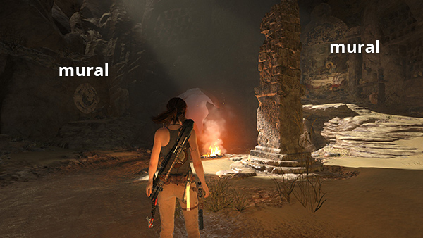 The first four murals in the level are just inside the ruins. To find them after completing the game, fast travel to the Syrian Cliffs Base Camp. When standing near the campfire and monolith, all four murals are visible. Here are the two on the west side. (Click screenshot to enlarge.)