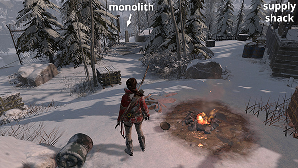 There are 3 monoliths in the Soviet Installation. All require various levels of Russian language proficiency. The monolith just down the hill to the southwest of the Communications Tower Base Camp and the Supply Shack only requires Level 1 Russian. Reading it reveals the locations of the first 3 coin caches on your in-game map. (Click screenshot to enlarge.)