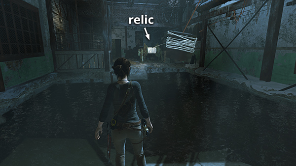 This relic is also in the Gulag, in the room with the shallow pool and huge electrical socket. If you miss it the first time, fast travel to the Gulag Base Camp. Then follow the instructions in the walkthrough for revisiting the JAIL CELLS, but instead of going all the way through, when you come to the room with the pool and socket, look for the relic behind the winch. (Click screenshot to enlarge.)