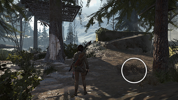 The first cache is buried a little to the east of monolith #1, behind one of the village cabins. Check the in-game map or annotated level map if you need help locating it. (Click screenshot to enlarge.)