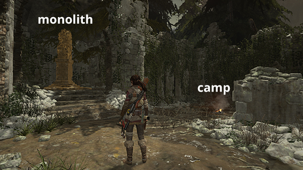 This monolith is near the Aqueduct Ruins Base Camp Examining it reveals the locations of coin caches 4, 6, and 8, shown below. You'll pass the monolith during your first visit to the valley, but since the coin caches are not nearby, they are covered later, in the Geothermal Valley Second Visit walkthrough. (Click screenshot to enlarge.)