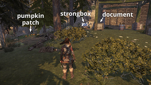 This strongbox is on the west side of the occupied village, under the wooden shelter near the Pumpkin Patch and document #22, which are marked on the map. To backtrack later, go to the Cathedral Courtyard Base Camp, climb the stairs, and drop down into the village. (screenshot) Head south, then west, through the village to find the strongbox. (Click screenshot to enlarge.)
