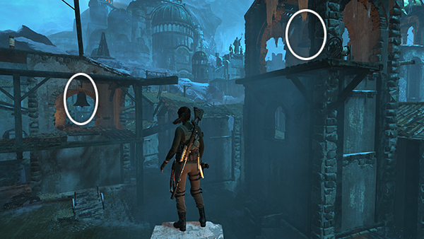 This bell is on the roof of the building where you find document #7. (map)It's easy to spot from most of the rooftops. Here Lara is standing on top of the first building where you land after riding the zip lines down from the Threshold of Kitezh Base Camp, looking northwest toward the first gate and the bell. (Click screenshot to enlarge.)