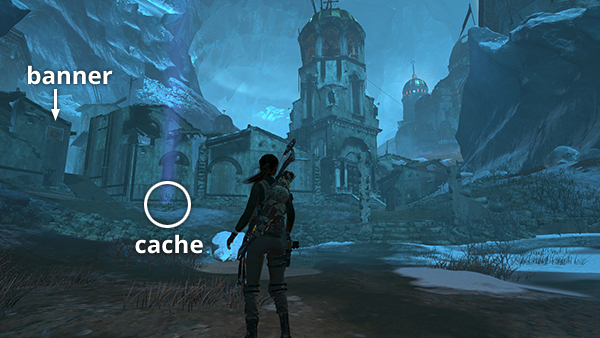 The next banner is hanging on the north side of the building with the Archivist Map. If you come up the hill from the challenge tomb entrance, as shown here, this is the first building on the far left. Another coin cache is buried nearby. (Click screenshot to enlarge.)