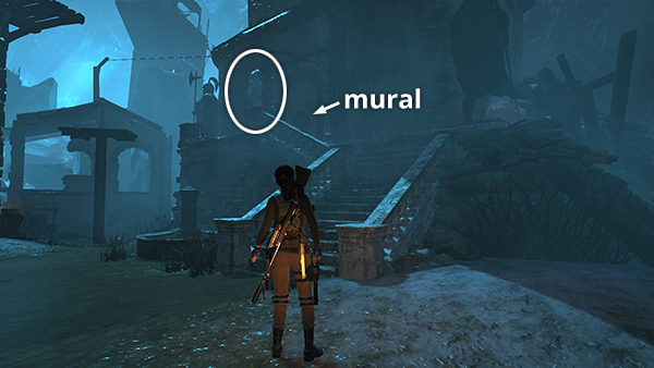 The first 2 bells are just below the Threshold of Kitezh Base Camp. One is inside the building where you land when you ride the zip lines down from the camp. The other is in the next building to the northeast. Here Lara is standing on the railing with mural #2 behind her. (Click screenshot to enlarge.)