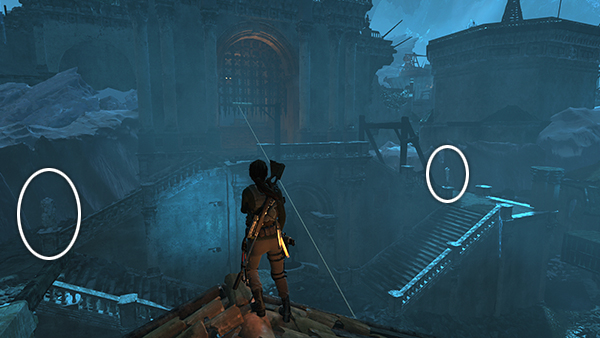 The last statue is on the roof above the plaza. To target it from below, stand near the zip line you used to reach the second trebuchet. If you pulled down the rope barrier earlier, you can take a shortcut from the Citadel Plaza Base Camp. (screenshot) Otherwise, follow the Part 2 walkthrough to get back to the zip line. Then face south, toward the camp, and look for the statue above on the left. You can also destroy it while crossing the roof on the way back from the third trebuchet. (screenshot) (Click screenshot to enlarge.)