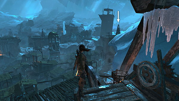 All but the fifth signal can be lit from the first trebuchet at the south end of the city. To get back there after completing the story, fast travel to the Threshold of Kitezh Base Camp, slide down the zip lines, and make your way to the southwest. Then climb up to the trebuchet as shown here.