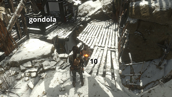 The next 3 documents are in the rope works area where you must raise the wooden platforms in order to reach the gondola. You can get all three on your first playthrough by following the walkthrough. Or return here later from either base camp. Document #10 is sitting on a crate in the northern corner of the lower level. (Click screenshot to enlarge.)
