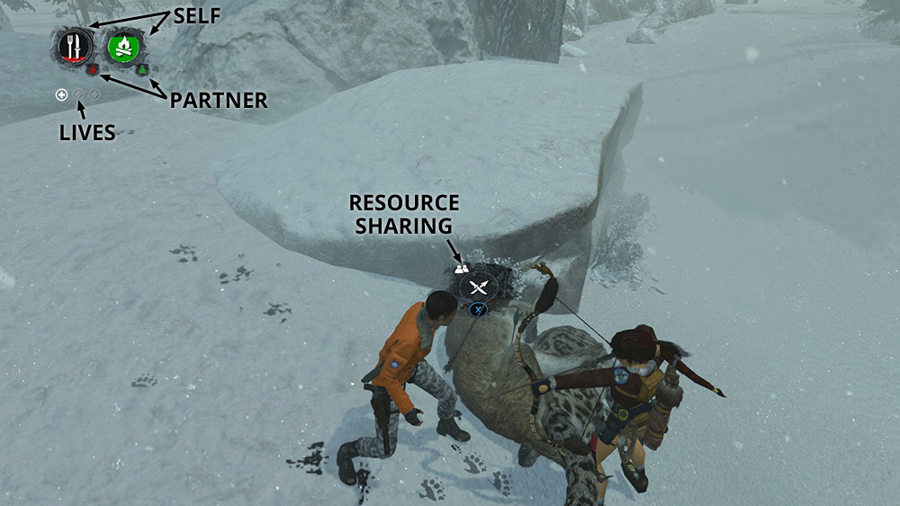 Just as your own status is represented by Hunger and Warmth meters at the top-left of the screen, so too is your partner's. Taking the form of a small, person-shaped icon to the right of each of your own, your partner's meters aren't quite as informative. They will simply switch from green, to yellow, to red, depending on your partner's condition, flashing when said condition is critical. (screenshot)