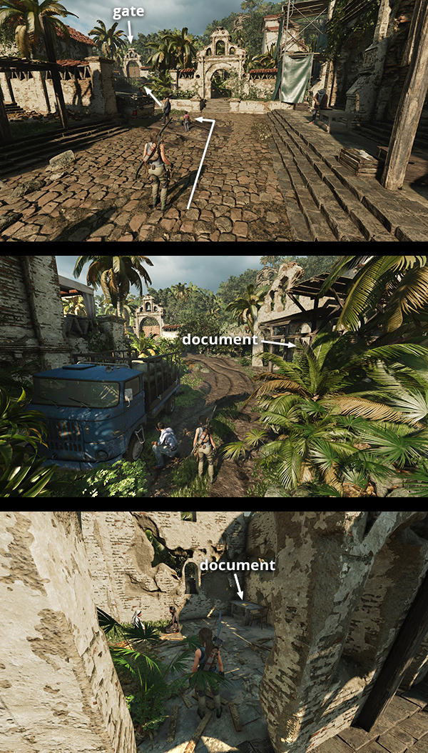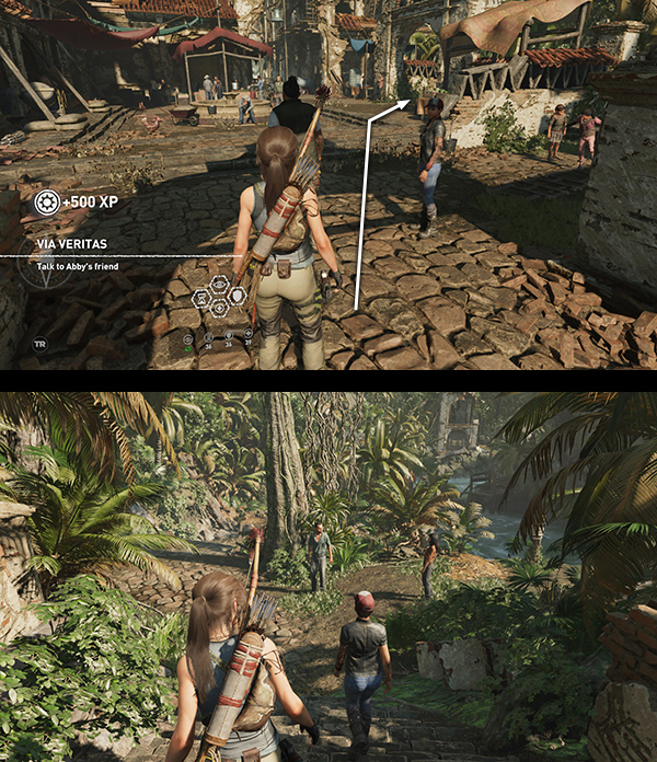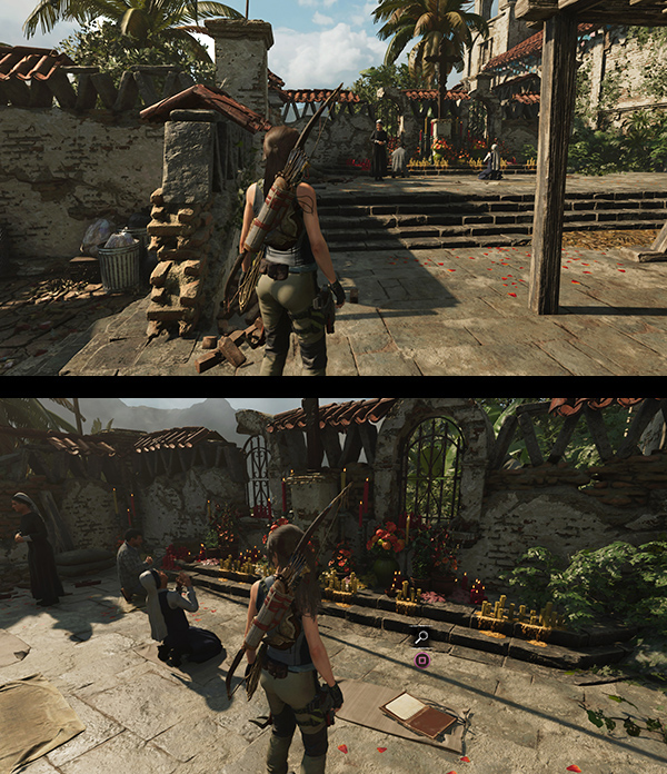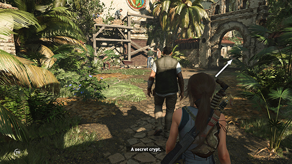 SIDE MISSION – STAR CROSSED (Explore the Local Mysteries): Before following the main story, speak to the mission giver, Guillermo, standing next to Sara. He explains that Isabela, another archaeologist and a special friend, has disappeared. She and Guillermo had a fight the night before and she hasn't been seen since. He suggests that Lara Investigate the Cemetery. Like all Side Missions, this one is optional, but it's required for 100% completion. It's also the only way to gain access to the level's single Crypt. The mission also takes you into one of the two Challenge Tombs and past a number of major collectibles, so this time I've included it in the main walkthrough. Details are below, after the bulleted list, below.