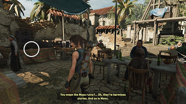 If you're doing the SIDE MISSION: STAR CROSSED – EXPLORE THE LOCAL MYSTERIES, stop and talk to Manu. He's just north of the Merchant, still surrounded by a group of kids. (screenshot) Lara tells him about her adventure in the tomb, and he presents her with a prized Artifact, a Skull decorated with gems (Mam/Metamorphosis), and of course you receive XP for completing the Side Mission.