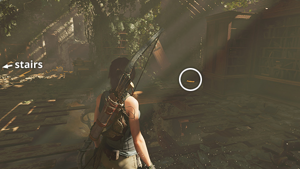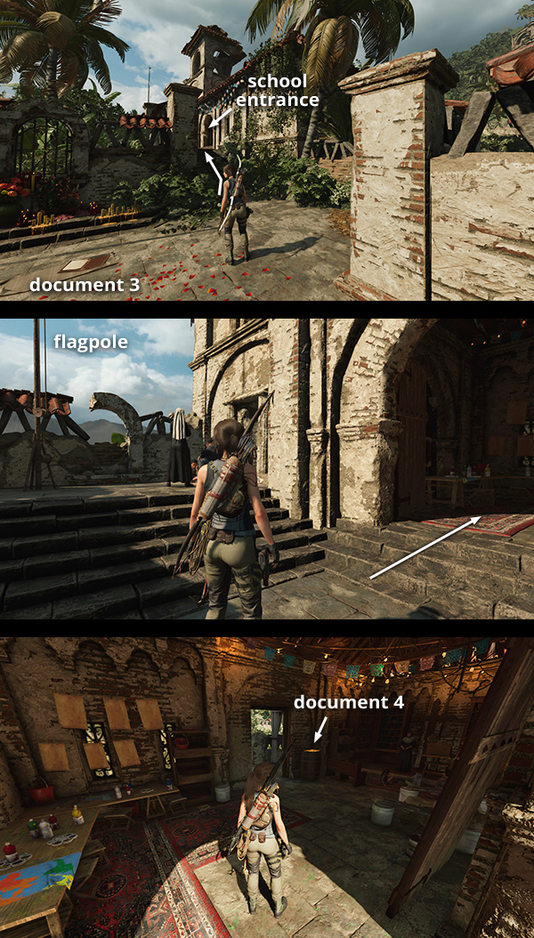 RETURNING TO THE MISSION LIBRARY: Once you've explored the rest of the level thoroughly, you should only be missing the last 8 documents. All are in the LIBRARY, where Jonah is waiting. You can fast travel back to the Mission Gate Base Camp and visit the Merchant in the COURTYARD to buy and sell resources before moving on with the story. Or, to get back there on foot from the second challenge tomb, start by swimming across the pool to the north side and scaling the climbable wall to the path above. (screenshot) Follow it to the left, across the fallen log above where you found backpack #3, and on to the Ruined Tower Base Camp. From there, continue along the path to the northeast, which leads across the rushing stream to the Riverside Base Camp. Then just climb the steps to the northeast to get back to the Mission. If you like, you can stop and talk to Guillermo and Isabela on the way, but this isn't necessary.