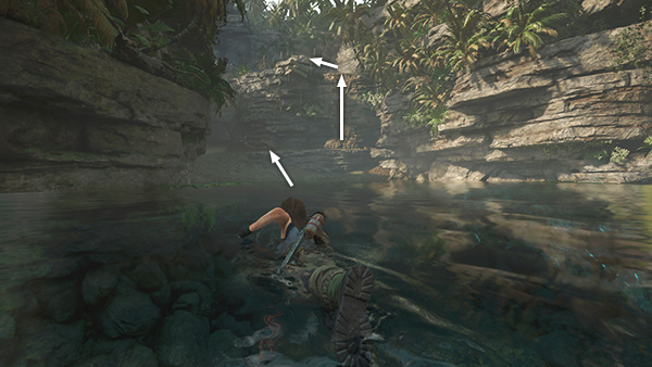 LARGE POOL SOUTHEAST OF THE MISSION: After completing the TREE OF LIFE CHALLENGE TOMB, you emerge near the Deserted Cloister Base Camp. If your inventory is getting full, you can return to the Mission (or Fast Travel to Kuwaq Yaku or Paititi) to sell off some resources. Then return here and head back down the steps to the east into the EMPRESS JAGUAR'S HUNTING GROUND. Lara will probably crouch as though there's danger, but if you just defeated the leopard before entering the tomb, it should be safe to pass through this area. Exit through the small opening in the rocks at the east side of the arena. (screenshots)
