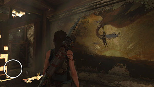 In the northeast corner of the main room on the upper level there's another crumbling wall with a clue behind it: "The sun will be darkened and the moon will not give its light." (screenshots) Lara pieces together the two clues—"under His wings" and "the sun will be darkened"—and immediately recognizes references to the Heron and Eclipse.