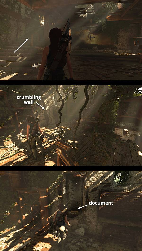 There's a document (13/27), The Hills Are Alive (Homecoming), sitting on one of the little tables in the corridor on the west side of the cloister. At the end of this corridor on the right, hidden behind some foliage, is an explorer backpack (2/3). Examining it reveals the locations of several survival caches: one in the cave you passed earlier on the way here, the rest in the second challenge tomb, which we'll explore after this one. Opposite the pack is a wooden barrier. Use a rope arrow to pull it down. This is the actual tomb entrance. (screenshots)
