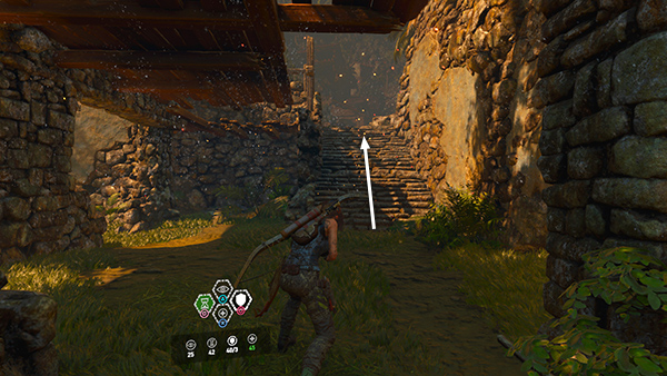 Now, move back into the alcove where you started and use the mud camo. You may not need it if you use this strategy, but if Lara is spotted, she'll have a better chance of hiding again if she's already muddy. Head for the right side of the alcove (when facing out toward the courtyard). Make sure Fear Arrows are selected and that you've crafted at least one. (If you reload a checkpoint, the game tends to automatically select Fire Arrows for some annoying reason.) Now shoot the man on the far left with a Fear Arrow. He's got a good angle on the others and he's holding a powerful gun. Watch as he goes apeshit and starts shooting his comrades. With any luck, he'll also set off a fuel barrel over in the far left corner, killing another soldier there. While everyone is occupied, scramble up the wooden wall onto the ledge above the alcove. If you move back into the shadows, you can see what the enemies are up to, but they can't see Lara. (screenshots)