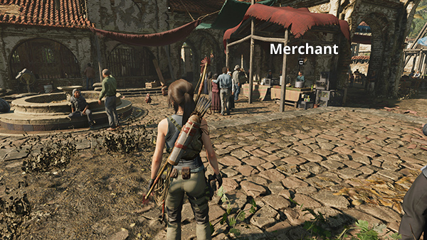 Return up the steps to the COURTYARD. At this point your inventory is probably getting full, so you may want to visit the MERCHANT standing under the awning to the northeast. (screenshot) She's cooking food for the volunteers working to repair the mission, but she also sells the following items: