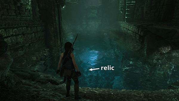 This relic is in the room with the pool between the entrance to the ruins and the Temple of the Moon. You can reach it from either base camp. If you have the reinforced knife upgrade, fast travel to the Tidal Caverns Base Camp. Follow the tunnel to the south. At the room with the small pool, turn right, cut down the braided rope barrier, pick up some jade, and cut down another barrier. The relic is just inside the next room on the left.