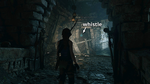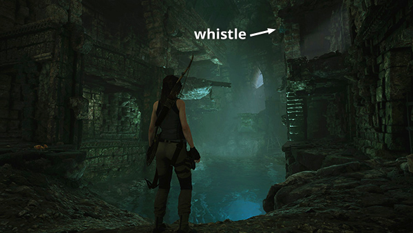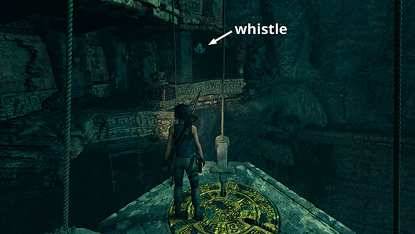 This whistle is in the huge cavern with the pyramid and dangling bell platforms. From the Tidal Caverns camp climb/jump across the bell platforms until you have a good view of the ledge in the southeast corner of the cavern. The whistle is hanging almost directly ahead if Lara is standing on the fifth bell facing the ledge. (Click screenshot to enlarge.)