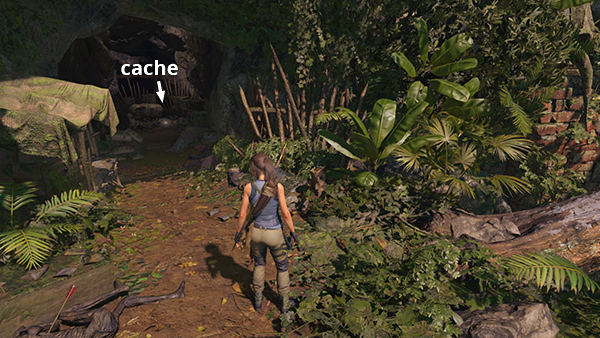 This cache is just outside the entrance to the Crypt of Urqu, The Scout, in the starting area where Lara retrieves her gear after the crash. From the Plane Wreckage Base Camp, head northwest. Climb onto the ledge near the crypt entrance, and you'll find the cache buried a few steps to the left of the tunnel opening. (Click screenshot to enlarge.)