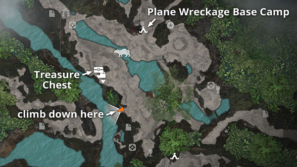 All treasure chests require the lock pick to open. Once you have acquired this tool, fast travel to the Plane Wreckage Base Camp. Then head south/southwest toward the edge of the ravine. At the spot indicated here on the map, climb down the cliffside then over to the left to reach a hidden cave with the treasure chest and document #13. The chest contains an Artifact (a Silver Mirror from the Day in the Life of a Paititian Story). The walkthrough includes details and screenshots. Climb back up the way you came, return to the base camp, and fast travel out to wherever you left off. (Click screenshots to enlarge.)
