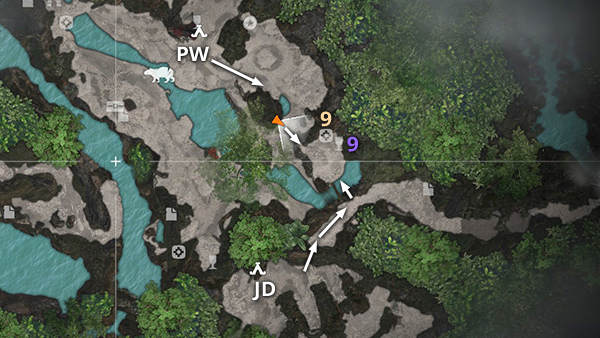 Or, If you don't want to deal with the jaguar, instead fast travel to the Plane Wreckage Base Camp and either swing over or climb up to the clearing from the south, as shown in this screenshot. (Here Lara is standing on the spot indicated by the orange triangle on the map detail.) The relic will then be just ahead on the left. When you're done, return to either camp for fast travel or continue on to Kuwaq Yaku via the path to the east.
