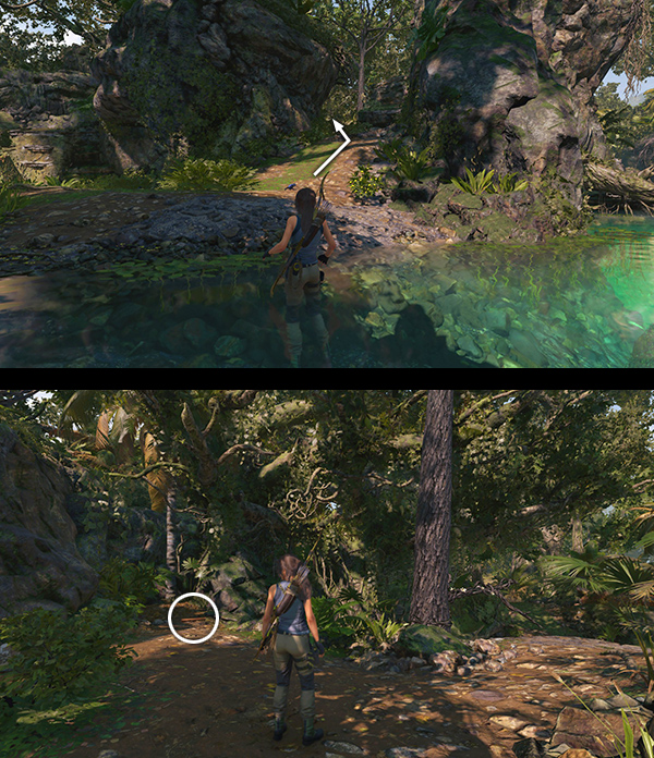 This cache only appears after you've deciphered the monolith, which requires that Lara be Proficient in the Quechua dialect. The monolith is in the drawbridge puzzle area about halfway between the Plane Fuselage and Jungle Ruins Base Camps. See the section for relic #6, above. Deciphering the monolith reveals a clue: "Two serpents guard life and death. I lie trapped within their eternal struggle." Climb the nearby steps to find the cache buried between the two stone serpent heads. Check the main walkthrough for more info. (Click screenshots to enlarge.)
