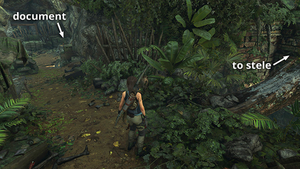 This document is also in the Underworld Gate Challenge Tomb. If you've already explored there, fast travel to the Canyon Ruins Base Camp. Then follow the tomb walkthrough to reach the document, which is just before the fallen tree you must cross to reach the puzzle area. Once you have the document, you don't need to take the circuitous route past the stele to get back to camp. Instead, exit the alcove with the document, turn right, and follow the path shown in these screenshots to get back to the Canyon Ruins camp. (Click screenshot to enlarge.)