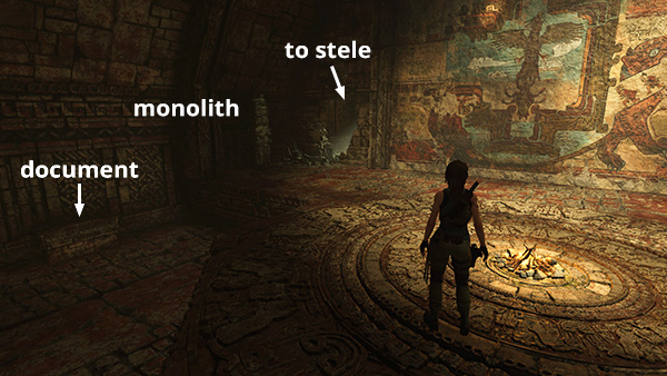 NOTE: If you're coming from the Temple of Light via the flooded cavern with the piranhas, you'll approach these documents from the north instead. Follow the main walkthrough if necessary.