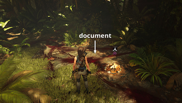 This document is lying on the ground near the Airfield Dirt Road Base Camp. This screenshot shows where it would be in relation to the campfire. Here's another screenshot from the main walkthrough showing the area on your first pass, before the campsite appears. (Click screenshot to enlarge.)