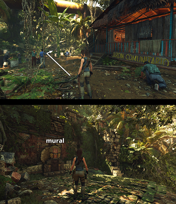 This mural is on the path leading to the side area west of the village. You'll pass it if you do the Invasive Species Side Mission. If you missed it, return to the Kuwaq Yaku Base Camp, head for the Community Gardens house, with the blue and red porch railings, northwest corner of the village. Follow the path to the west. Crawl under the fallen tree and continue along the path. The mural is just ahead on the left. (Click image for more and larger screenshots.)