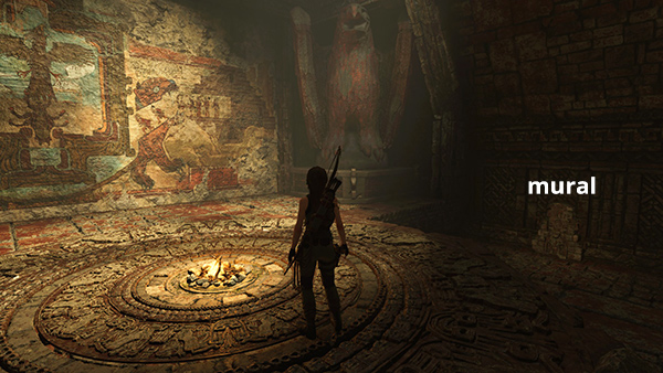 This mural is inside the temple north of the village MARKETPLACE. If you missed it the first time, fast travel to the Kuwaq Yaku Ruins Base Camp and follow the muddy path west to the clearing with the Eagle icon on the in-game map. The temple is here on the right. Go inside and you'll find the mural directly ahead, at the top of the stairs. (Click image for more and larger screenshots.)