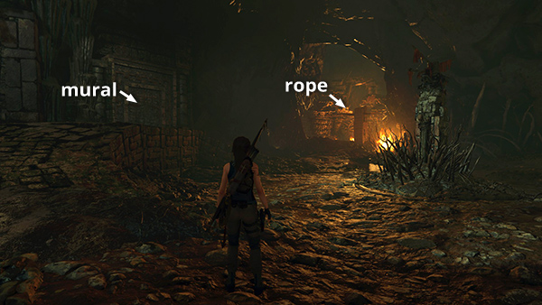 This mural is on the southeast wall of the large room with the Temple of Life Challenge Tomb. This camp only appears after you complete the level and move on. From here, you can either continue through the flooded cavern to the northeast or use the camp to fast travel away. (Click screenshot to enlarge.)