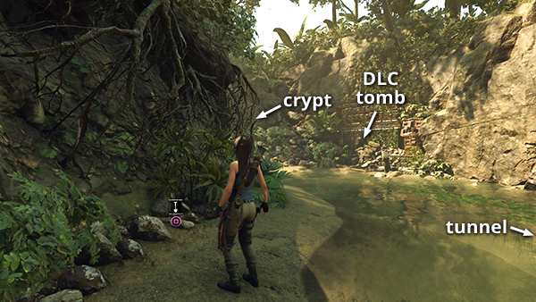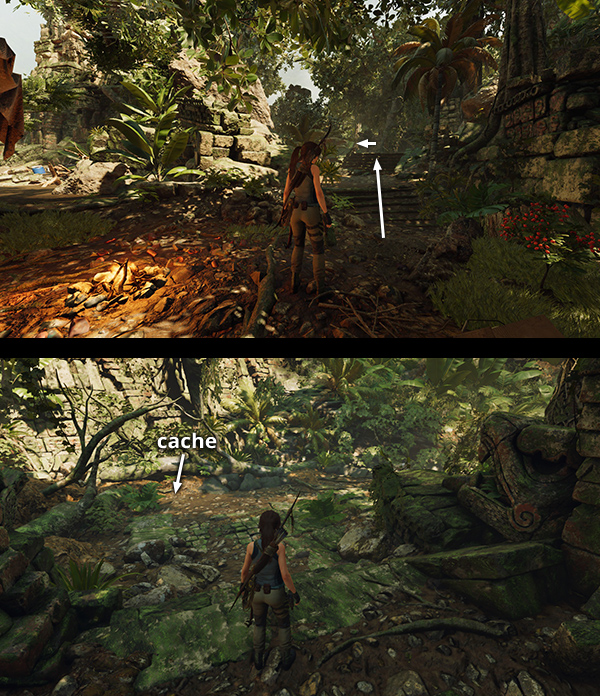 The first cache is just outside the entrance to the Crypt of Wayta, the Tyrant. From the Kuwaq Yaku base camp, head north across the rusted metal footbridge toward the village. Then jump off the left side of the bridge and follow the river west to the crypt entrance. (screenshot) The cache is buried on the riverbank a short distance southeast of the tunnel leading into the crypt. (Click screenshot to enlarge.)