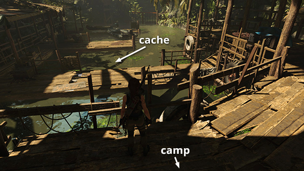 This cache is at the bottom of the pool beyond the temple on the north side of the village. Fast travel to the Kuwaq Yaku Ruins Base Camp and follow the muddy path west to the clearing with the Eagle icon on the in-game map. The temple is here on the right. Go inside and climb the stairs all the way to the top to emerge on the ledge overlooking the pool with the cache. You can't climb back up into the temple, so follow the river northwest to the Docks Base Camp. You can fast travel away from there. (Click image for more and larger screenshots.)