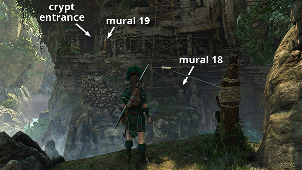 The entrance to this crypt is also in the gorge east of Paititi. Again, follow the main walkthrough to find it during the 'Rebellion Lives' chapter. Later in the game, fast travel to the Temple of Kukulkan Base Camp. Then climb down the cliff wall below the campsite to reach the crypt. The crypt walkthrough has details and additional screenshots. (Click screenshot to enlarge.)