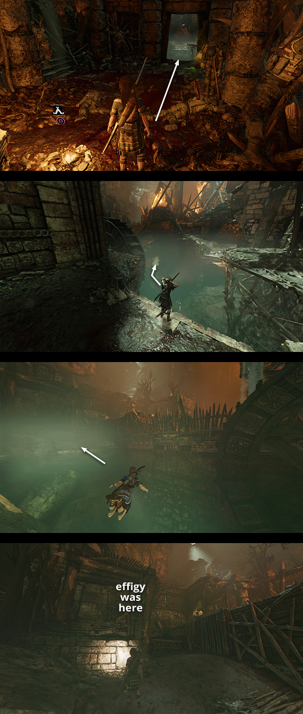 I had already completed the challenge when I revisited this area. The last screenshot shows the effigy in its original place during my first play-through. (Click image to enlarge.) Like the others, it's also marked with a red dot on the annotated map. If that's all you need here, return to the campfire and fast travel away.