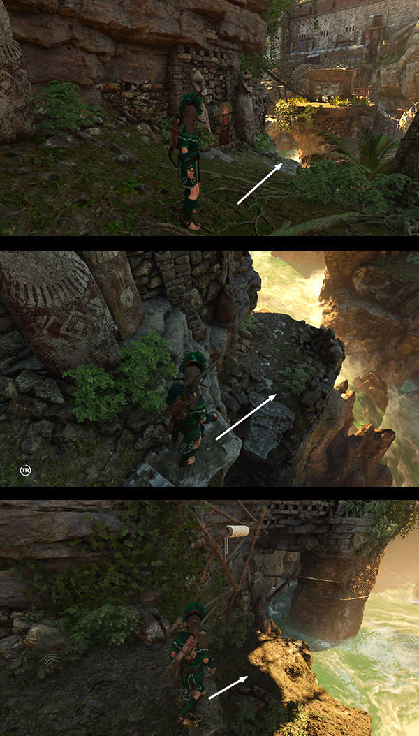 TALL CAVERN WITH CLIMBABLE WALL AND CEILING: Next, you enter a high-ceilinged cavern and Lara notices a carved head above. Loot another resource container and dig up a survival cache (28/34) on the left. Then climb the steps on the right and follow the stone ramp up and around toward the climbable wall. Jump from the end of the ramp to the climbing wall. Climb up and to the left. Then jump to the left and latch onto the next section of climbable wall. Climb up and to the right as far as you can. When you reach the top of the climbable wall, jump straight up and press Interact to latch onto the craggy overhang. Lara's sandals automatically sprout magical climbing cleats! Hurrah! Continue climbing upward along the overhang. At the top, climb to the right a bit and you'll be prompted to rappel. Dangle from the rope line, move the camera to face the barred opening below the huge, carved head. Swing back and forth then jump onto the ledge. (screenshots)