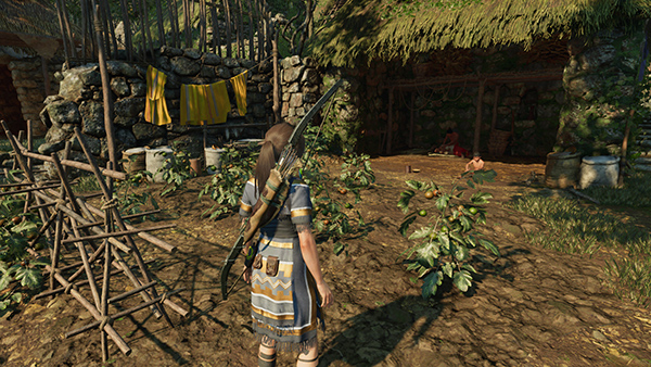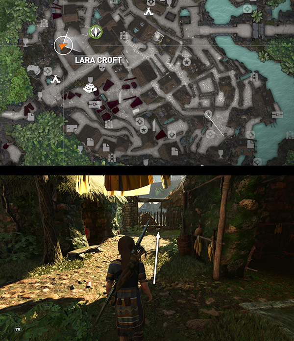 Kabil and Abra can be found at their home, on the west side of the river. The location is marked with a green icon on your map. (screenshot) The house has tomato plants outside and some yellow cloth hanging from a line. (screenshot) When you approach, the couple's son rushes out to meet Lara then calls his father. She asks for the Horn and Kabil refuses. The boy explains that when the cult heard that Kabil was making the Horn, they poisoned the family's crops, causing Abra to fall ill. The boy's brother, Cualli, went to the market for healing herbs but hasn't returned.