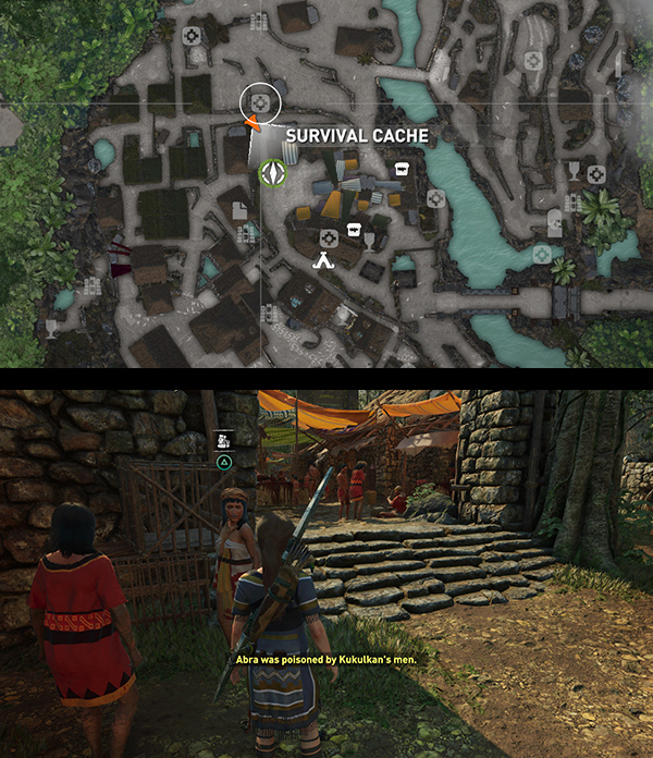 Lara offers to Go to the Market to investigate. If you head for the green mission objective marker near the west entrance to the MARKET, you'll overhear two women talking about Abra's poisoning. (screenshots) Speak to one of them and she'll tell Lara that the boy, Cualli, is being held by one of Kukulkan's men.
