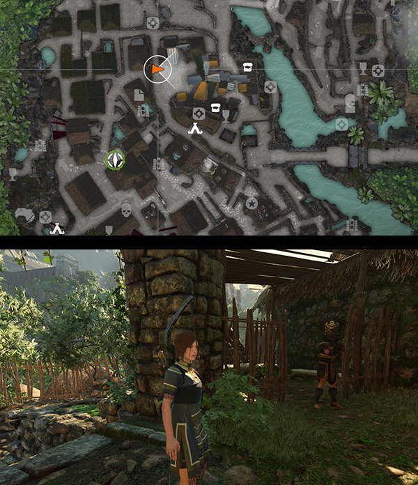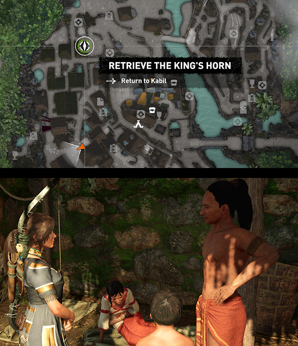 When this mission is first introduced, the mission giver, Uchu, can be found with Jonah near the Unuratu's Home Base Camp. (screenshot) Later in the game, they will both move to the SKULL CAVE, so you may accept the mission there. This will be covered in the HIDDEN CITY REVISIT WALKTHROUGH. Uchu tells Lara that he's sent three of his best scouts to retrieve three sacred items for Etzli's coronation: the King's Horn, the Savior's Amulet, and the Champion's Bow. Uchu already has men going after the Amulet and Bow, so Lara offers to help Retreive the King's Horn from the instrument maker, Kabil. The goal is to Speak with Kabil, but Uchu suggests she might also approach Kabil's wife, Abra, since she has a mellowing influence on her cranky husband.