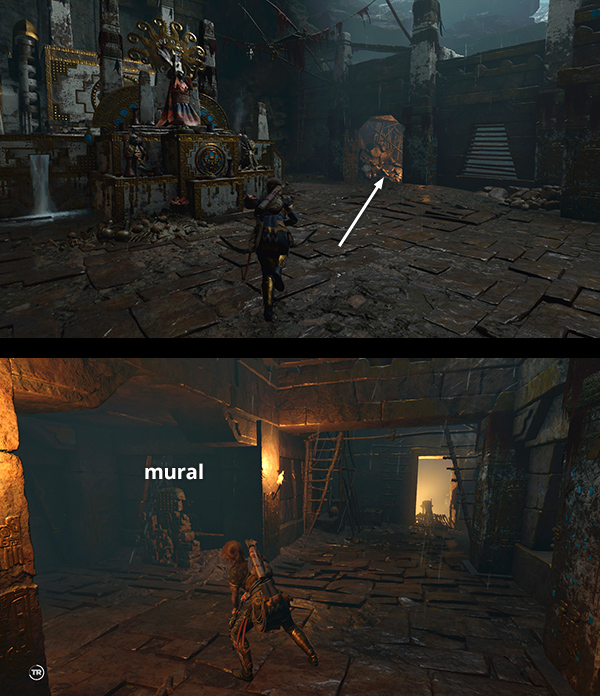 ANTEROOM ABOVE THE COURTYARD: As you enter the building, a new area loads and there's no going back. The goal is now to Move Deeper into the Mountain. Lara goes into a defensive crouch indicating there are enemies nearby, but it's safe to drop down into the empty room. There's a document (3/4), Q'orianka's Orders (Mam/Age Makers), in the alcove on the right (west) side of the room (screenshots) and a mural (3/3), Legend of the Shield (also Mam/Age Makers), in the alcove to the northeast. (screenshots) After examining both move to the doorway overlooking the next area, loot the resource canister sitting next to it (screenshot), and peer out to get the lay of the land.