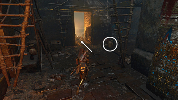 When you've killed the last enemy, Lara says, "There's a way in somewhere." She doesn't relax her defensive posture, but you're free to explore the courtyard, search the cultists' bodies, and gather supplies, craft arrows and/or special ammo, and get ready for another fight. Then head for the south end of the courtyard and climb the wooden slats to the ledge above the closed door. Sneak through the rectangular opening into the next room. (screenshot)