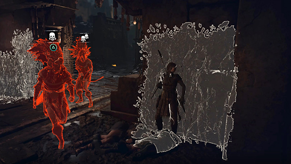Wait in the doorway until the man nearest the doorway is isolated (yellow in survival instinct) then move out onto the jutting beam and press Melee to drop down on him. Then move behind the low stone blocks on the left so the others can't see you. There's a basket of healing herbs here in case you need them. (screenshots)