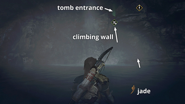 When you're ready to tackle the Path of Huracan, exit SKULL CAVE and head for the waterfall at the north end of the river, just beyond the Fishing District Base Camp. (screenshot) While you're here, check to see if the jade deposit below the falls has respawned. Then climb out onto the ledge and scale the climbing wall on the left. The CHALLENGE TOMB ENTRANCE is on the ledge above. (screenshot)