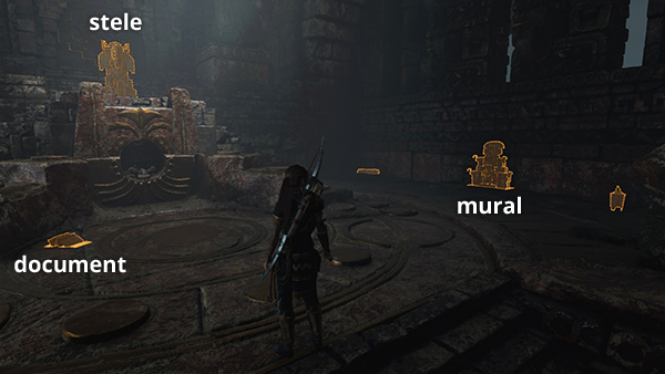 Before you leave this area, examine a document (2/4), Ritual Book (Mam/The Age Maker), on the floor near the empty receptacle where the shield was, a mural (2/3), The Shield's Cradle, (Mam/The Age Maker), on the right wall, and of course the tomb stele. Doing so unlocks a new Path Skill: A Thousand Eyes, which allows Survival Instinct to remain active longer while Lara is on the move. (screenshot)