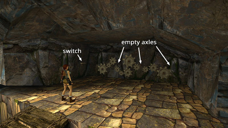 ANCIENT MACHINE: Cross the bridge and place the 3 MACHINE COGS in their proper spots. (You'll notice wooden shafts sticking out where the missing cogs belong, and if you have Action Indicators enabled in the Controls menu, you'll see the telltale hand icon (or exclamation point in the initial, un-patched game), as explained early in the Caves walkthrough.) Throw the switch on the left to start the machine. (screenshot) A little way downstream, a gate moves, diverting the stream off to one side, thus shutting off the waterfall. (screenshot)