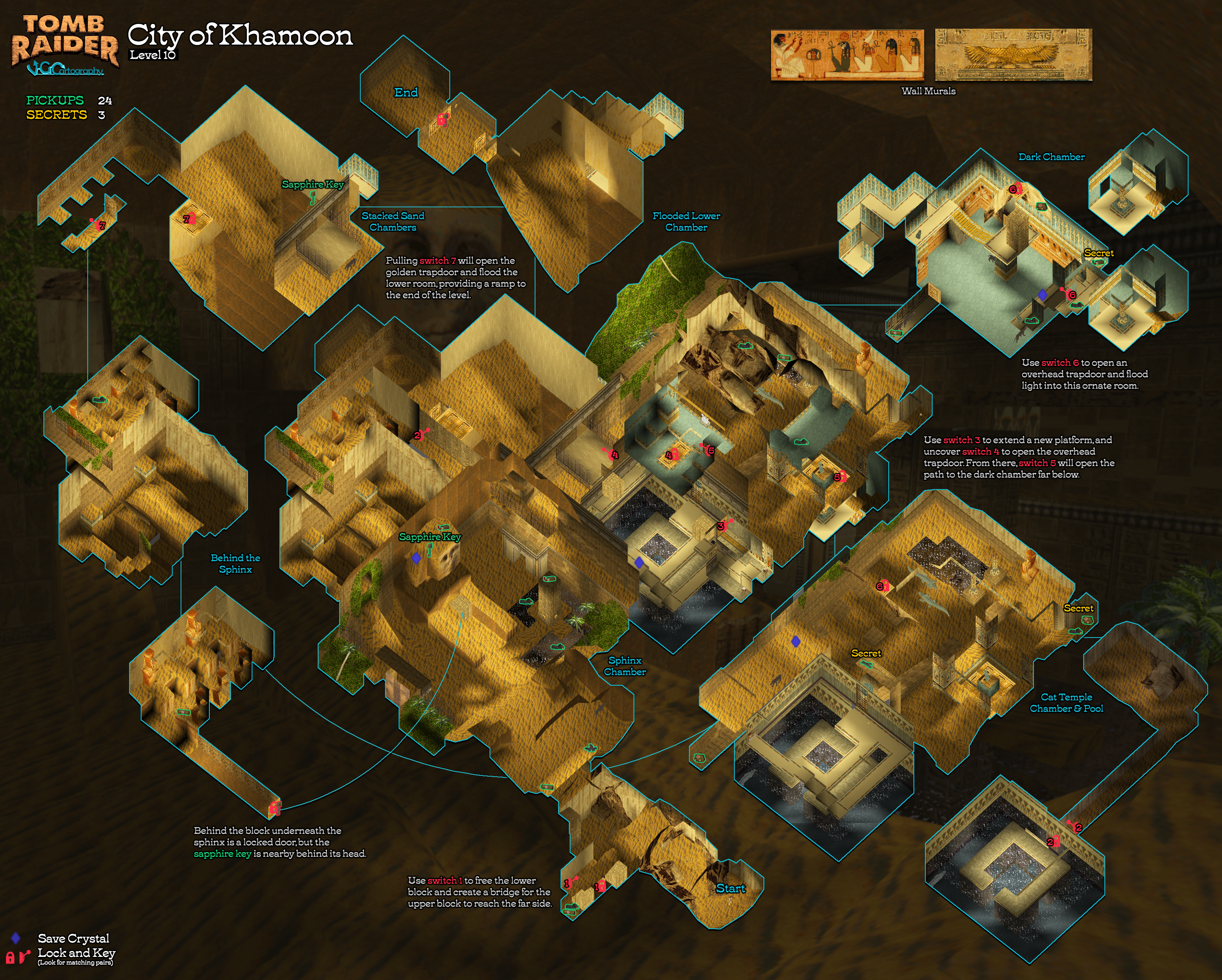 OBJECTIVES: Explore the area near the sphinx to find the first sapphire key, which will unlock the second part of the level. There, you'll need to find a switch to open the cat temple, then locate a second sapphire key to unlock the exit.