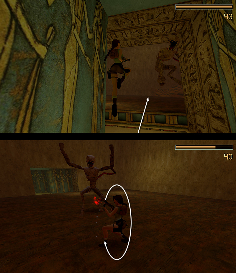 Alternatively, follow the passageway into the sandy room with the mummy, run/jump past it into the open room, and fight. (screenshots) If it gets Lara cornered in the narrow hallway, she'll take a lot more damage. If you have shells to spare, use the shotgun. (Three clean shots at close range will take the mummy down.) Otherwise, just keep firing, jump and roll as needed, and don't hesitate to pause the game and use a medi pack.