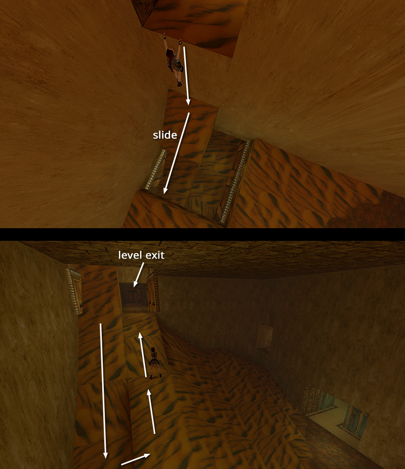 LEVEL EXIT: Return across the small ledges to the opening above the SAPPHIRE KEY ROOM. Approach the opening cautiously. It's a long way down. To avoid injury, safety drop onto the slope below the opening and slide down. Then turn around and go up the slope just to the right of the one you came down. (screenshots) At the top is a room with gold doors. Use the SAPPHIRE KEY to open them and exit the level.